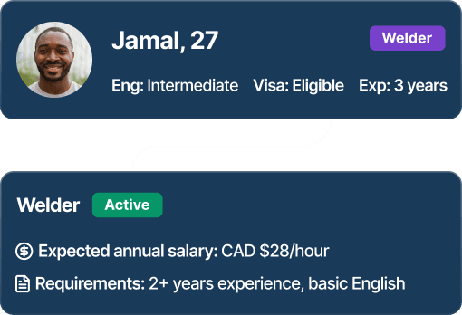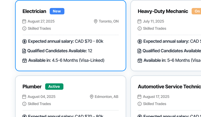 Get matched with Canadian employers looking for skilled tradespeople like you. We support your journey from job offer to work permit and relocation.