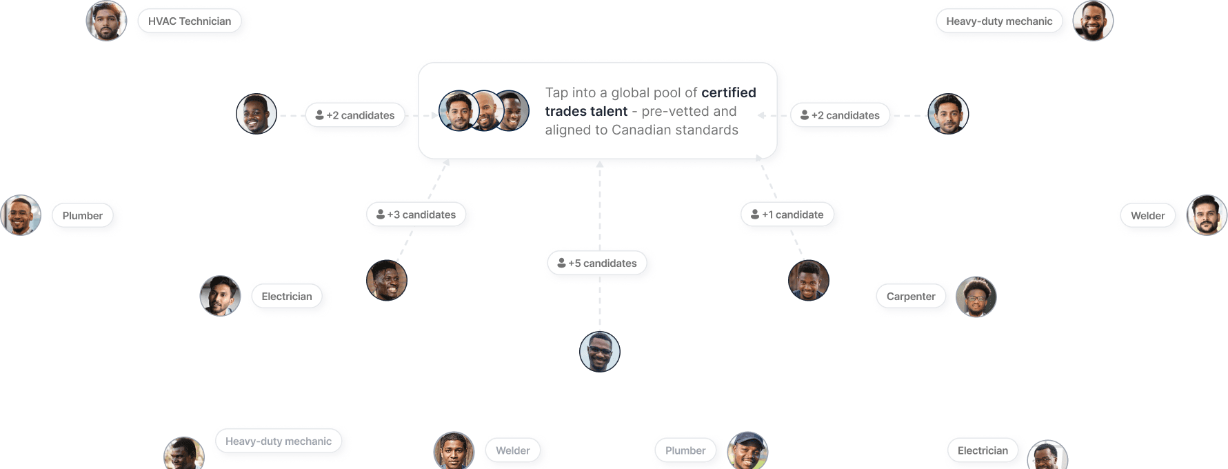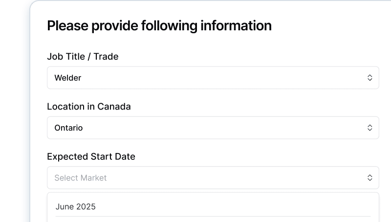 Tell us which skilled trades roles you need filled, the location, and start date range, etc. We help define the right candidate profile based on job requirements and immigration feasibility.